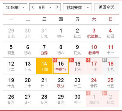 根據《國務院辦公廳關于2016年部分節假日安排的通知》和省政府辦公廳有關通知精神,2016年中秋節放假日期新鄉市天豐振動機械有限公司具體安排如下:9月15日至17日放假調休,共3天。9月18日(星期日)上班。